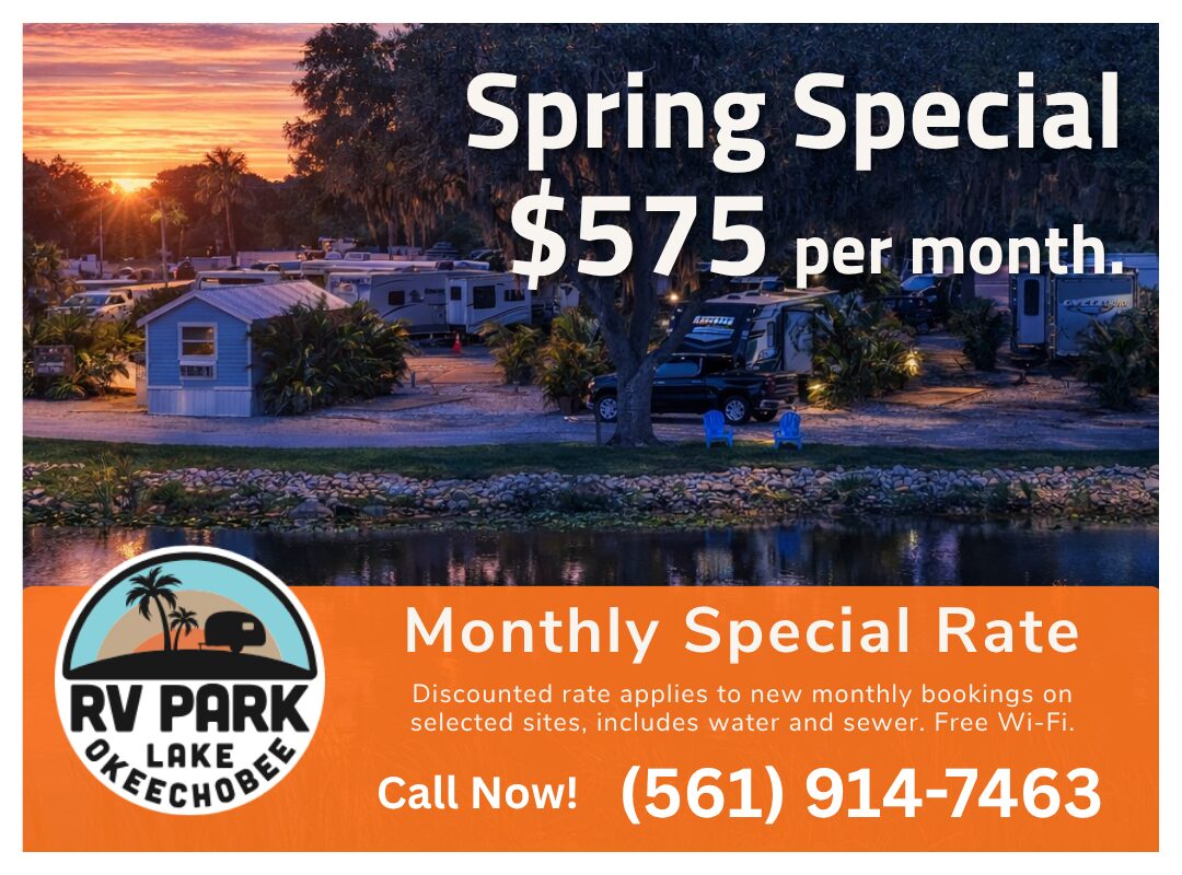 Choose from a variety of spacious RV sites or one of our charming bungalows, each offering full hookups, concrete patios, and lush surroundings for your perfect getaway. Whether you’re planning a weekend escape or a long-term stay, booking your spot at Lake Okeechobee RV–Park is easy and convenient—start planning your adventure today!